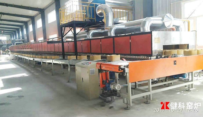 陶瓷坯体可直接置于辊子上或将坯体先放在垫板上,再将热板放在辊子上,由于辊子不断转动,可使坯体依序前进。每根辊子的端部都有小链轮,由链条带动自转,为传动平稳、安 全、常将链条分若干组传动。